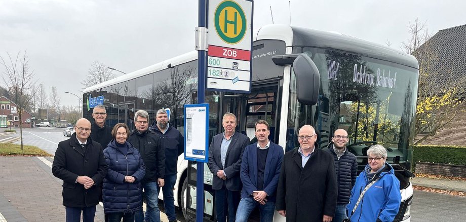 (v.l.n.r.) Landrat Dr. Martin Sommer, Andreas Lastering, Bürgermeister der Gemeinde Wettringen, Christa Lenderich, Bürgermeisterin der Stadt Ochtrup, Carsten Rehers, Dezernent des Kreises Steinfurt sowie Matthias Ehling, Bernd Bils, Christian Erfmann, Rolf Frie, Dorian Hagemann und Vera Teroerde (alle Veelker GmbH & Co KG.).