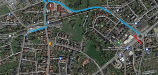 Die Umleitungsstrecke für die R 80 verläuft über die Händelstraße - Kreisverkehr Feuerwehrgerätehaus - Bilker Straße zum Busbahnhof bzw. in umgekehrter Richtung.